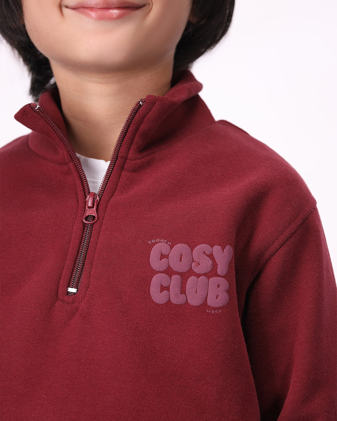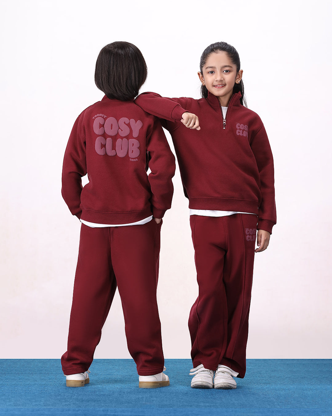 Crafted from 300 GSM cotton fleece, this set is all about soft comfort and easy style. The mock neck quarter-zip top keeps your little one snug while adding that clean, sporty look. Paired with pleated baggy trousers, it’s designed for movement, comfort, and everyday wear.