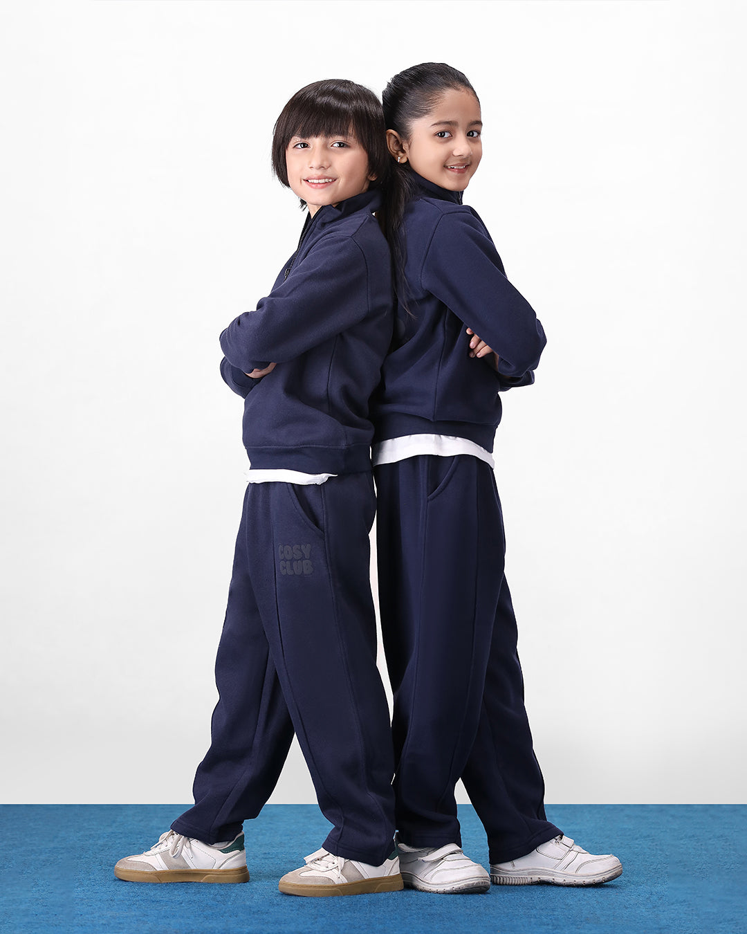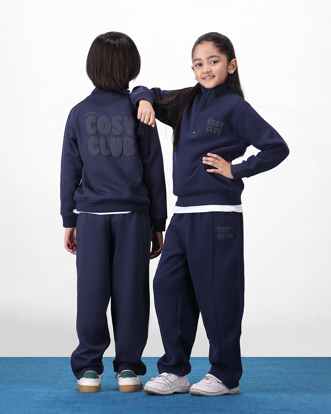 Crafted from 300 GSM cotton fleece, this set is all about soft comfort and easy style. The mock neck quarter-zip top keeps your little one snug while adding that clean, sporty look. Paired with pleated baggy trousers, it’s designed for movement, comfort, and everyday wear.