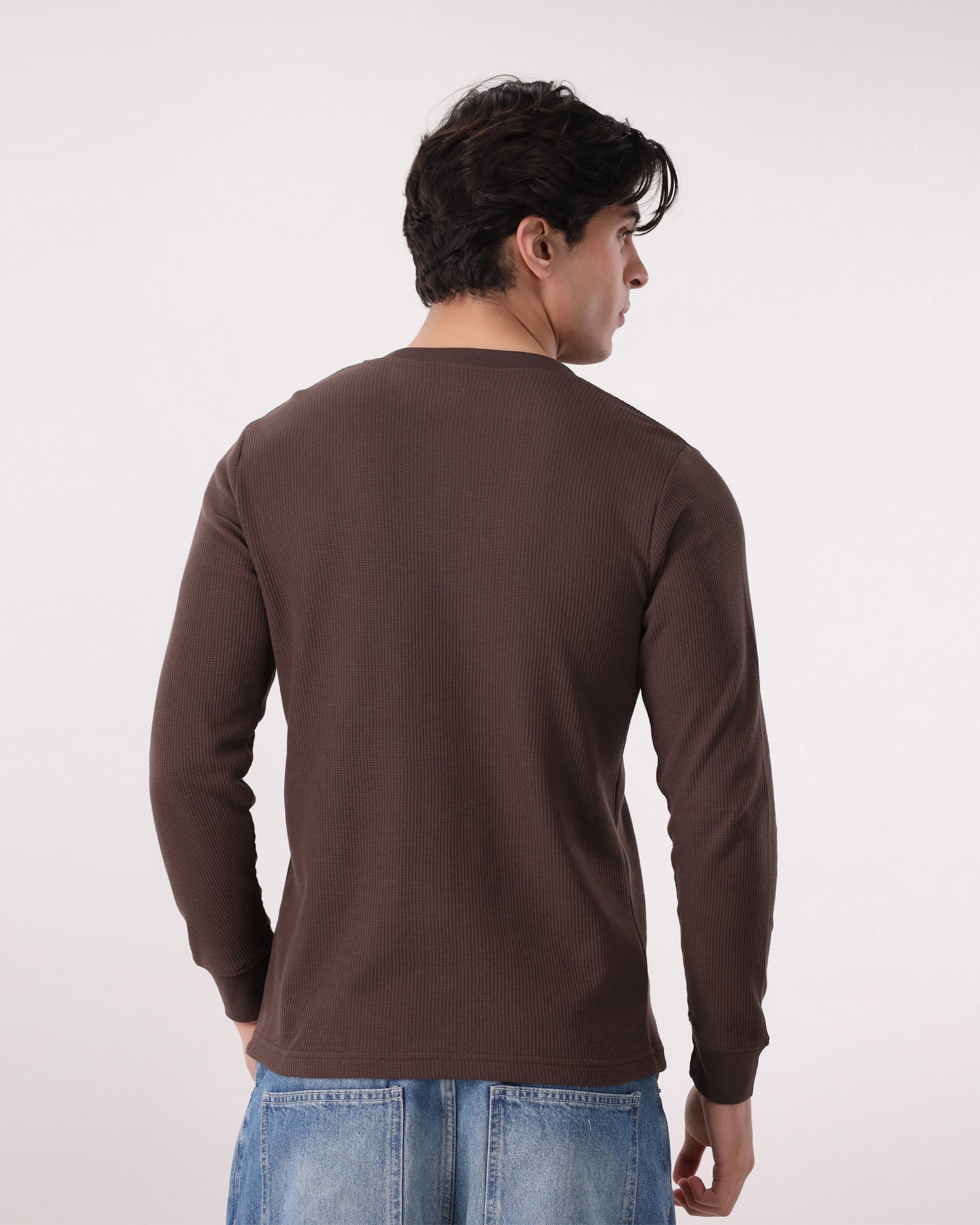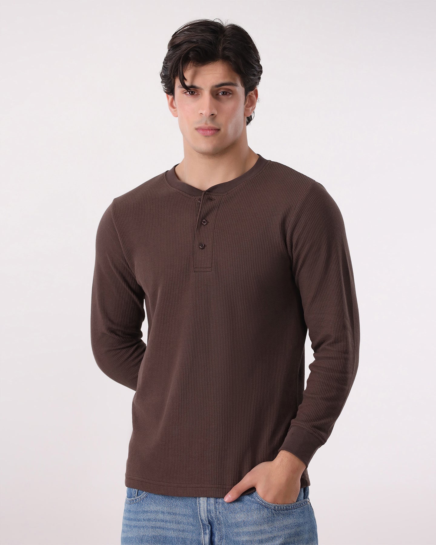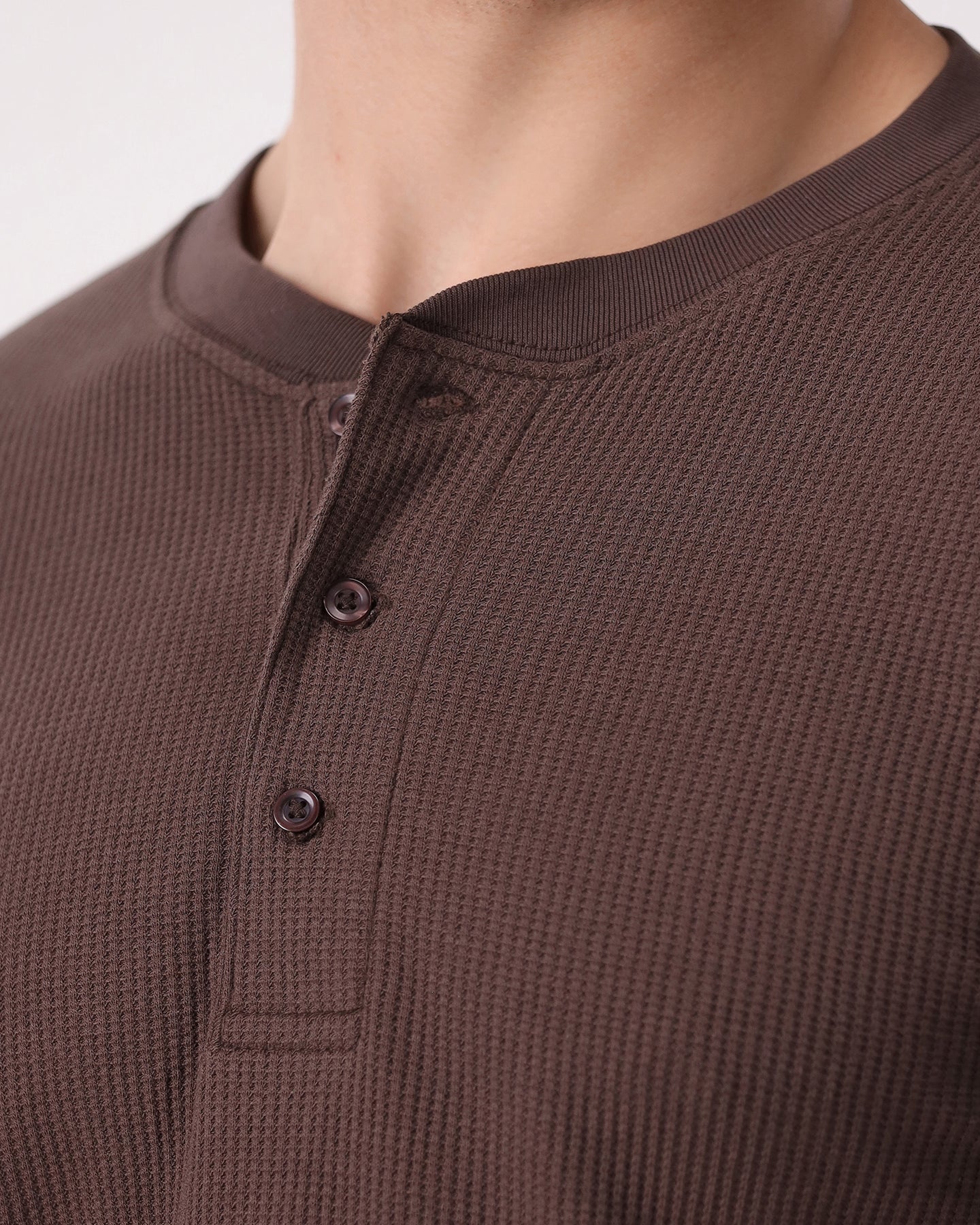 Waffle Knit Thermal Henley - Brown