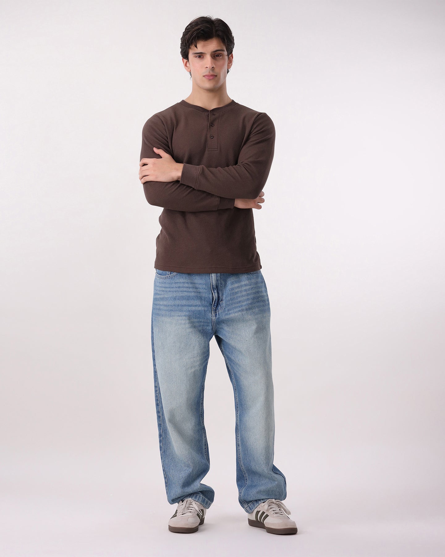 A mid-season essential crafted in 250 GSM Nova Waffle. Designed with a classic fit, 3-button Henley neckline, and ribbed cuffs for everyday comfort.